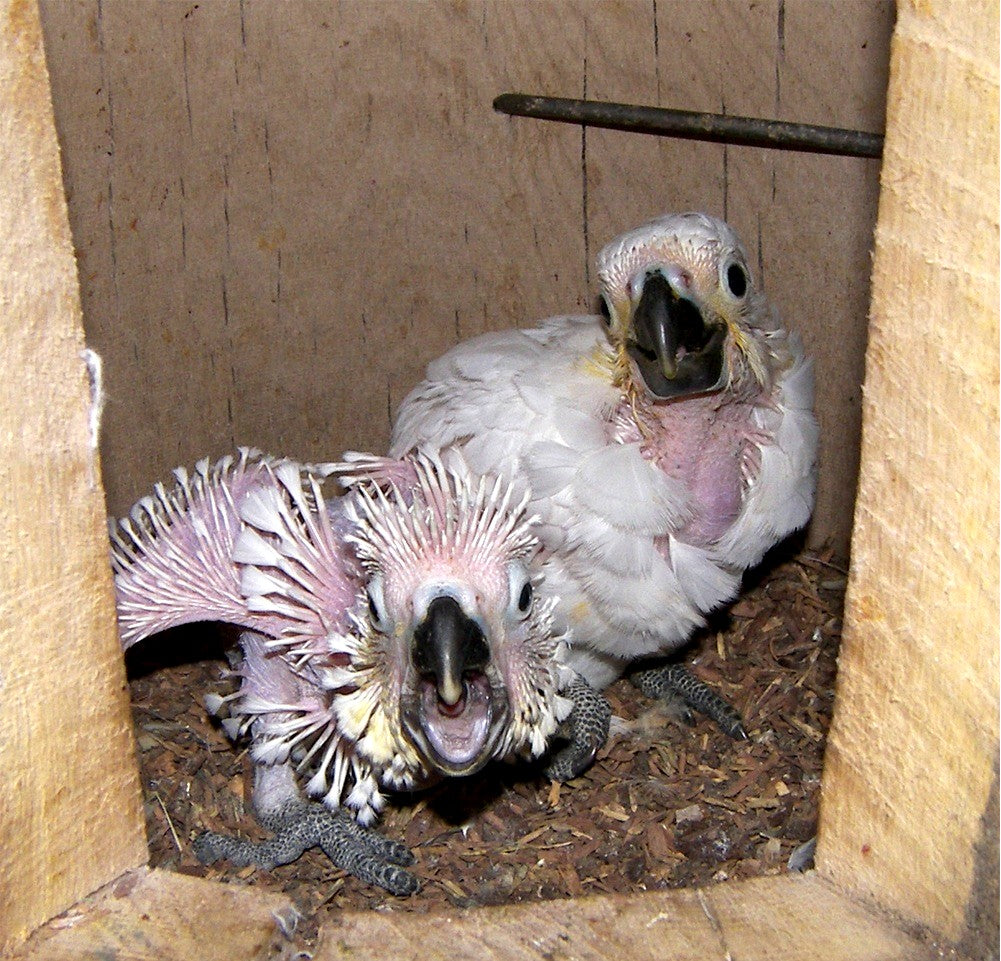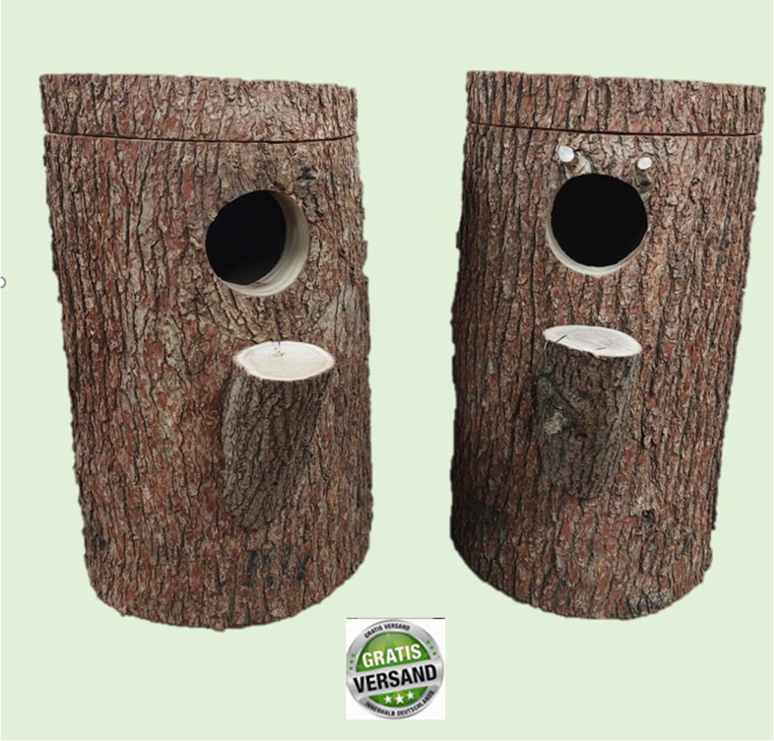 Zwei Nisthöhlen für große Kakadus (Molukken-. Weißhauben-, Tritonkakadus usw.) aus Eichenholz. Hochdruckgereinigt, vorgetrocknet und mit Welleisen im Boden, Deckel und Ring ausgeschlagen. Gesamthöhe: 80 cm, Bohrung 37+35 cm, Flugloch 14 cm. Sie erhalten die abgebildeten Nisthöhlen. Inkl. Einstieghilfen (Metallbügel), Anflugast und seitlicher Kontrollöffnung. Kostenloser Versand per Spedition inkl. telf. Avisierung.